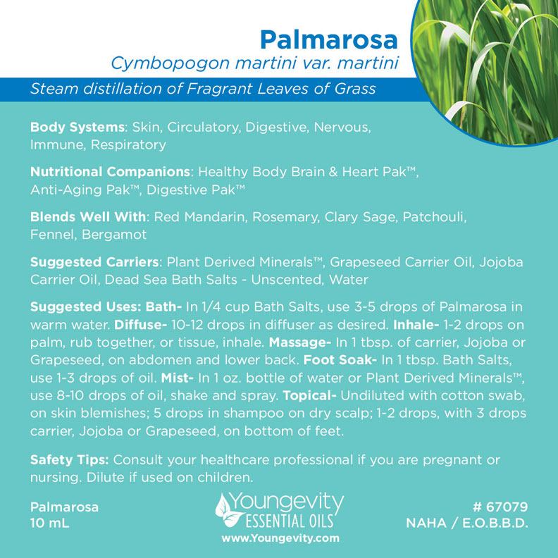 Palmarosa (Cymbopogon martini), also known as Rose Geranium, is fast becoming a firm favorite in essential oil therapy and aromatherapy, as it has excellent skin care properties and is also used to relieve minor aches and pains, while calming the mind and uplifting and invigorating the spirits. Palmarosa oil has no known contraindications and is considered a non-toxic, non-irritant and non-sensitizing essential oil.*